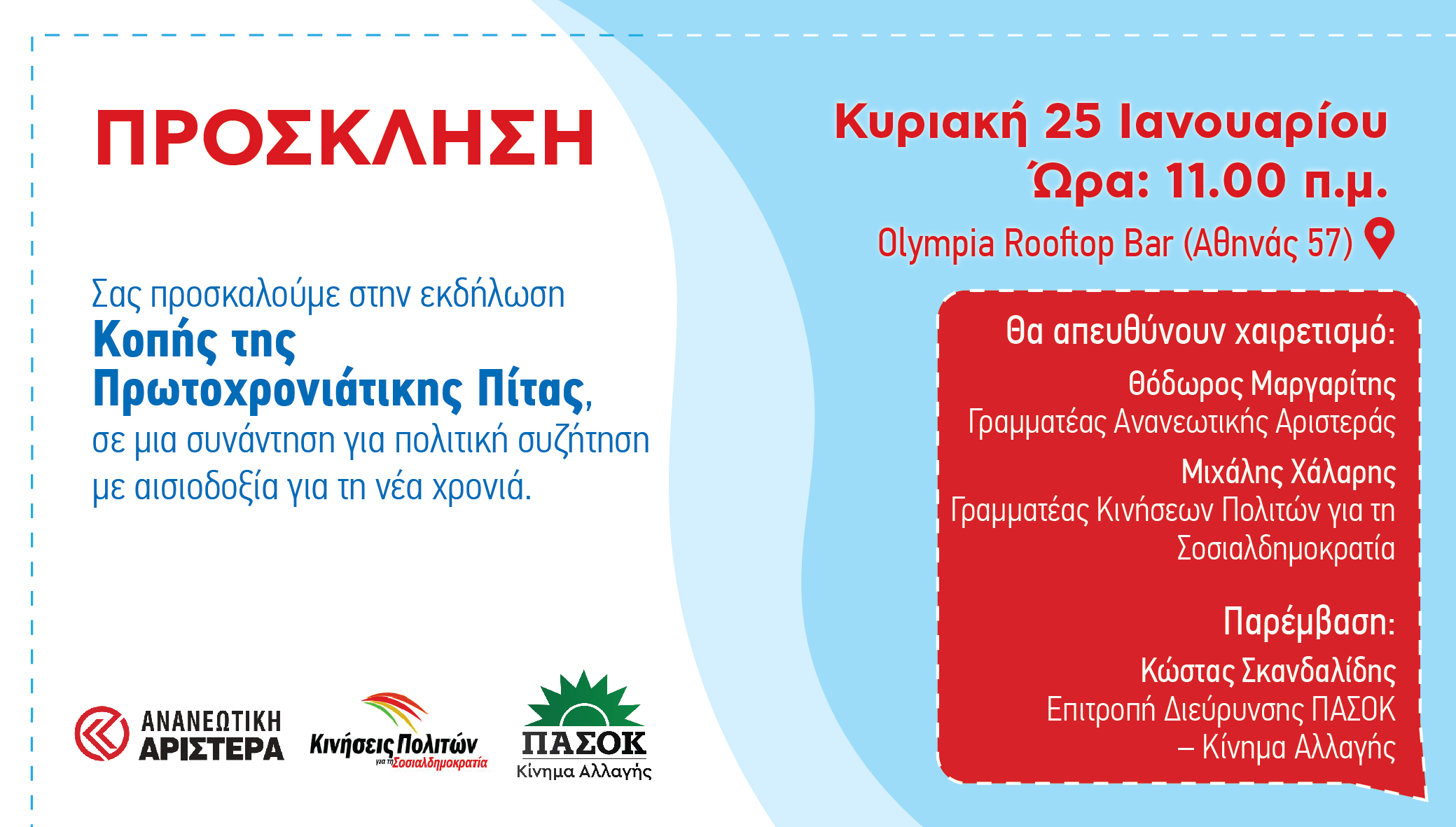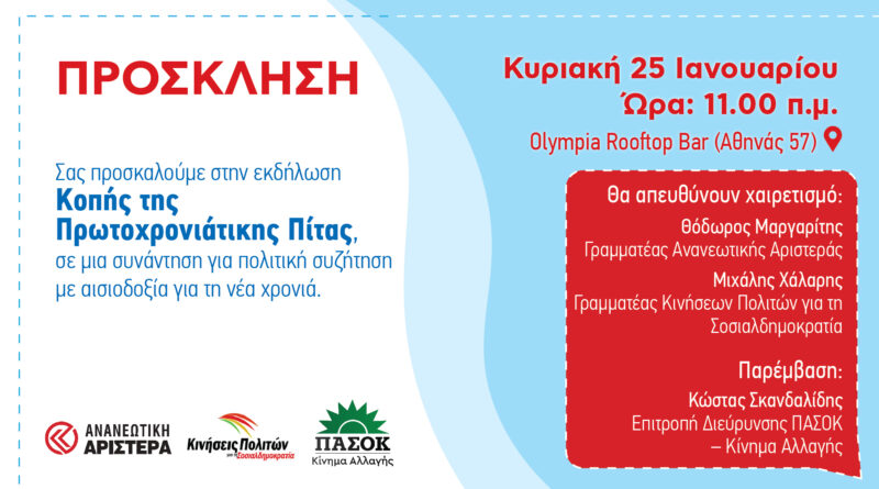 Η Ανανεωτική Αριστερά και οι Κινήσεις Πολιτών για την Σοσιαλδημοκρατία σας καλούν στην εκδήλωση κοπής της πρωτοχρονιάτικης πίτας την Κυριακή 25 Ιανουαρίου, 11 π.μ στο Olympia Rooftop Bar (Αθηνάς 57) σε μια συνάντηση για πολιτική συζήτηση με αισιοδοξία για τη νέα χρονιά.